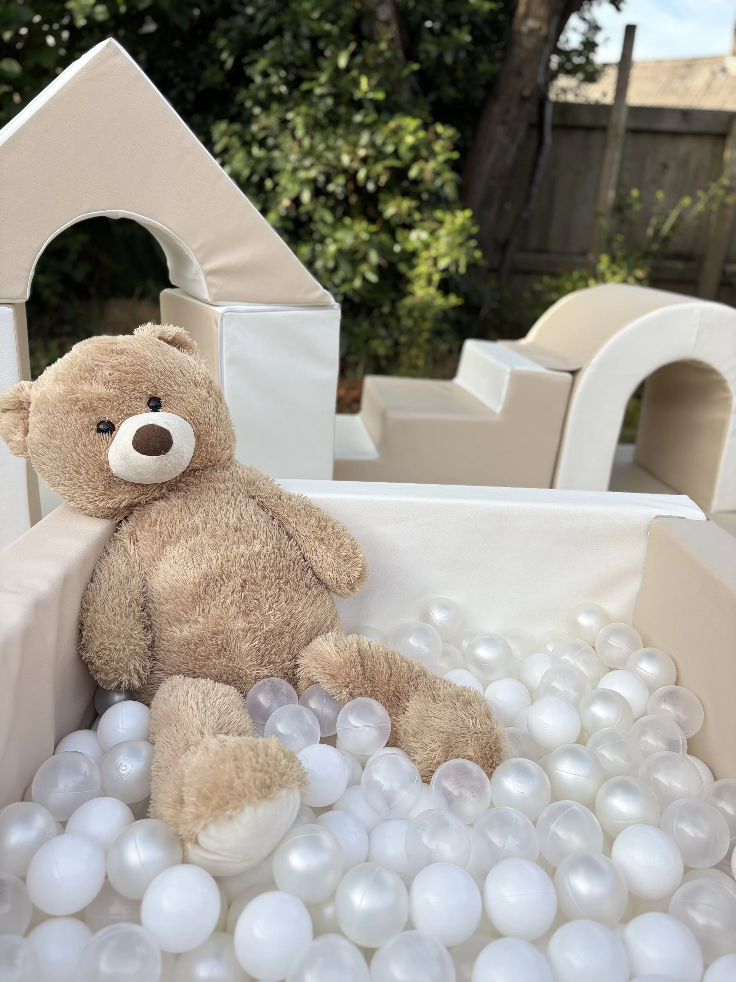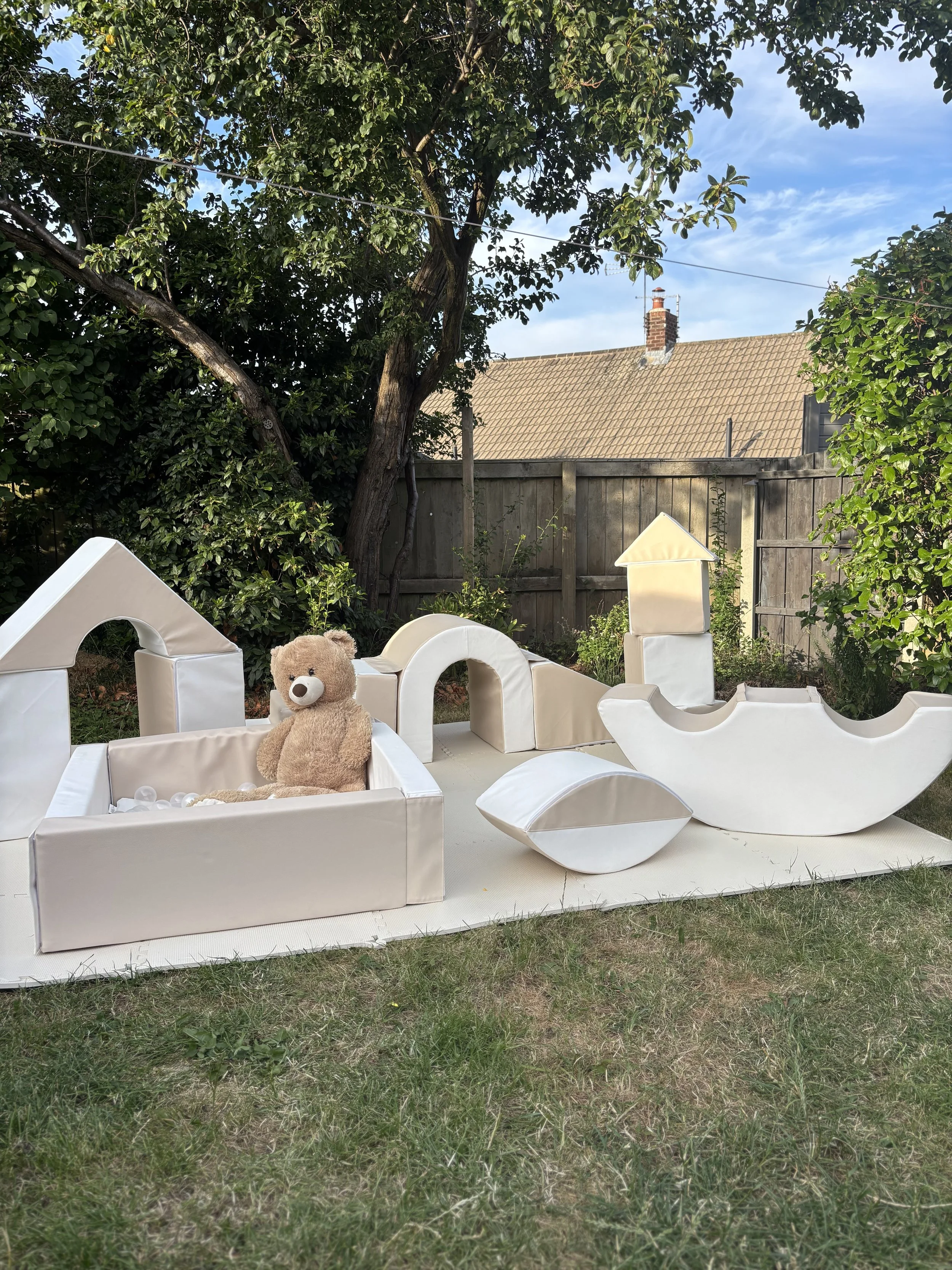 Our basic soft play hire includes a white and beige set featuring a ball pit with your choice of coloured balls, a castle, blocks, an arched bridge, a slide, and a double rocker.